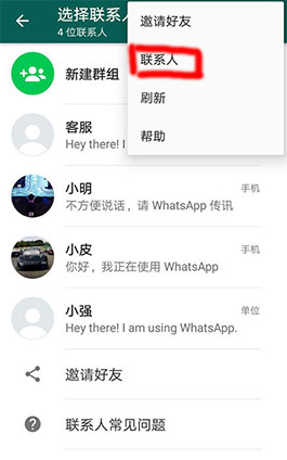 WhatsApp 能够自动侦测手机通讯录中哪些是 WhatsApp 联系人,可以点击刷新按钮刷新联系人。